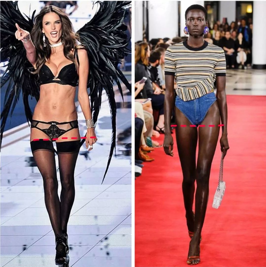 真正腿长的人,上半身较短,下半身长,肉眼可以判断的就是腕线过裆。超模AA(左)出了名的五五身材,可以明显看出她的裆线只到虎口。右边的黑人姐姐,应该来自外星。