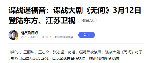 早在3月上旬就有传闻,称《无间》将由东方卫视和江苏卫视于3月12日联袂播出。