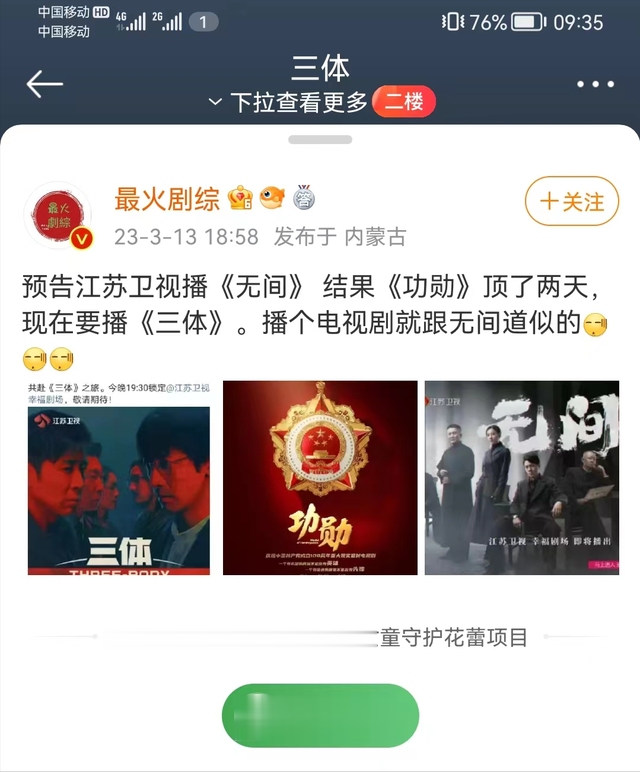 江苏卫视本文开头已经说了,从3月13日开始二轮播出《三体》,到15日也才第三天,没有极特殊情况,总不至于停播《三体》后再播出《无间》吧。