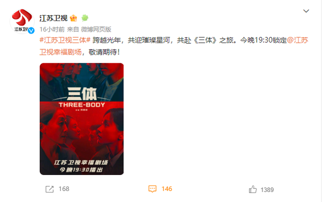 最关键的是,就在大家都以为江苏卫视3月13日晚间黄金档“幸福剧场”会播出时,时间节点到来前不到三小时,江苏卫视忽然官宣,今晚要“共赴《三体》之旅”。