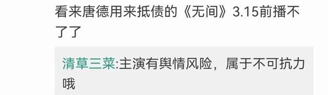 其实就在传出这个消息时,便有人发帖称《无间》3月15日之前根本播不了,原因是主演有舆情风险,属于不可抗力。