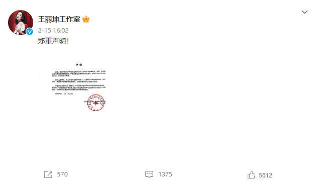 按理说这件事很可能牵扯不到王丽坤,可蹊跷的是,工作室2月15日辟谣后一直到现在,一个月时间,没发过一条有关王丽坤的动态。