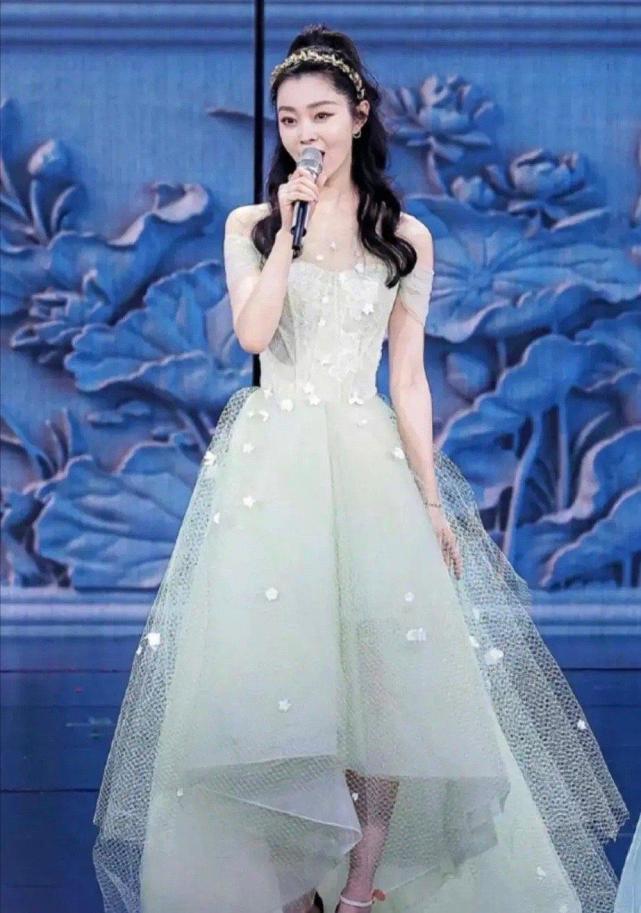 整个舞台设计非常浪漫,如诗如画一般,而赵丽颖在这么瑰丽的舞台中,以一身白色墨竹长裙现身。