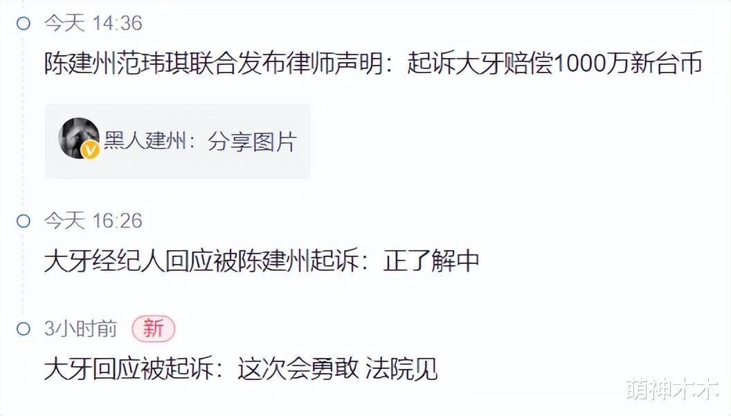 一直以来,大家都默认是陈建州一人起诉大牙,实际上,最开始可是范玮琪和陈建州联手起诉大牙的,要求对方赔偿1000万台币。