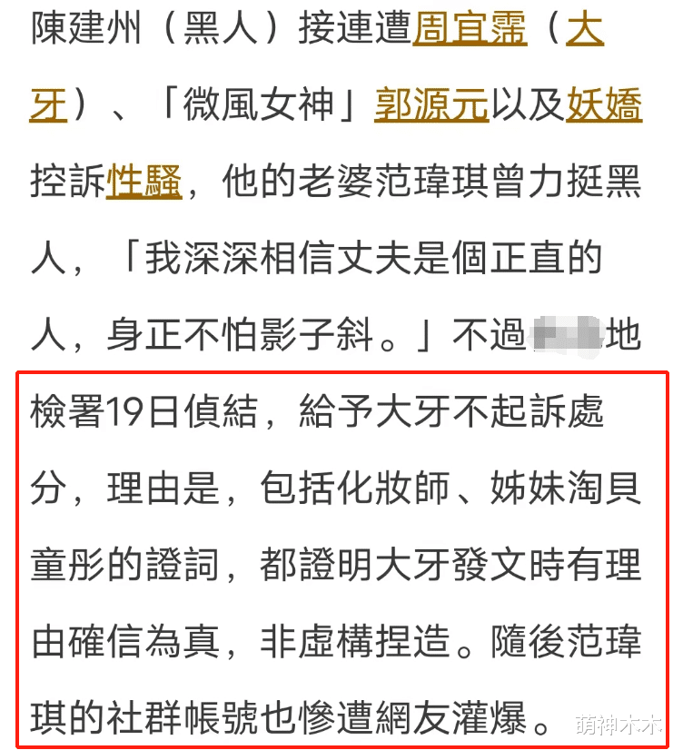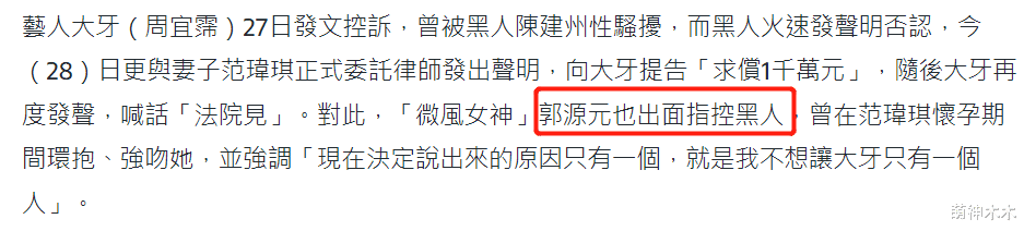 女星郭源元在大牙遭到陈建州、范玮琪联手起诉之后,第一时间发布长文力挺大牙,讲述了自己被陈建州骚扰的经历,很多细节都和大牙的控诉隐约对应。