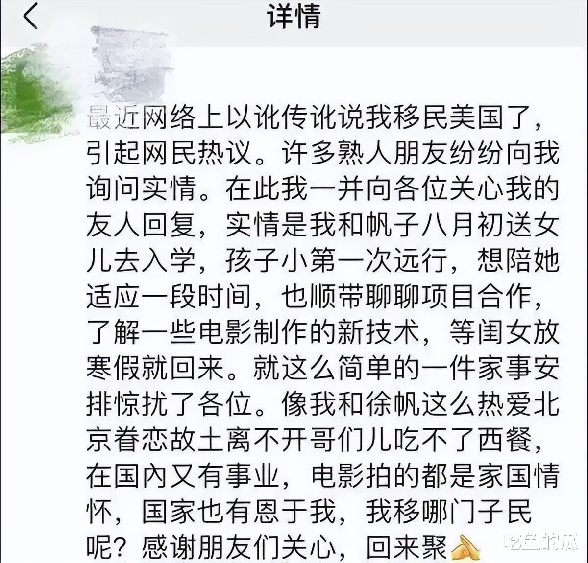 前段时间,冯小刚为了女儿读书,还和徐帆专程去了美国陪伴,为此还被很多人误会说是移民,甚至还被人晒出了在美国豪宅会客的照片,称冯小刚已经定居美国。