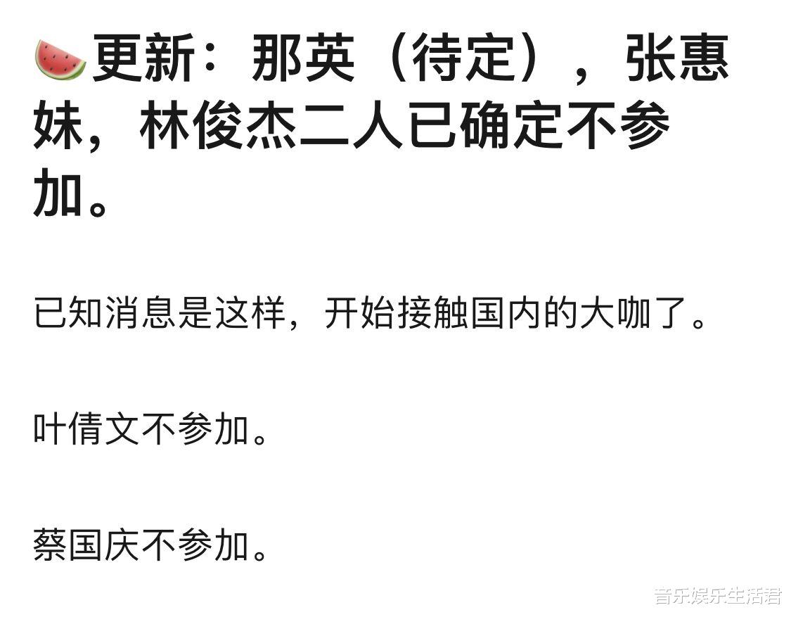 第一位确认不参加的歌手是林俊杰。节目组接触了,但瓜主爆料出来,林俊杰确认不参加。