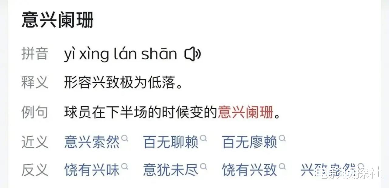 按照相关解释,该词是形容兴致低落。比如“球员打了很久的球,到了下半场的时候变得意兴阑珊。”