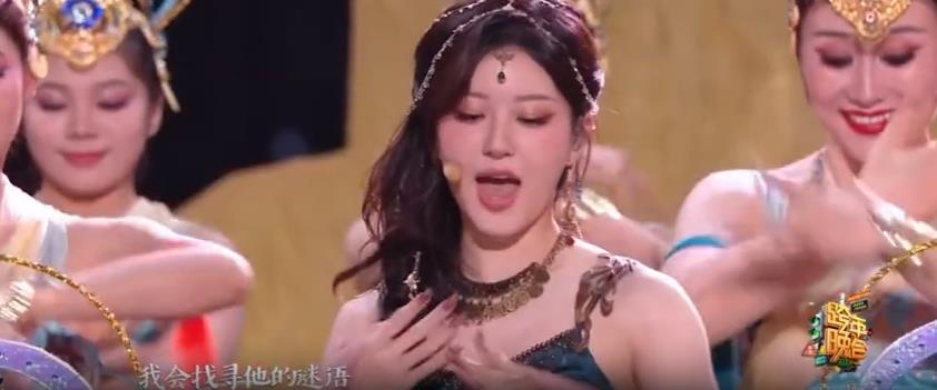 赵露思站上湖南卫视跨年晚会的舞台,只见她一身异域风情的露肚装,大方秀出纤细的腰肢,并将一头长发绑成辫子,双臂缠上粉色的丝带,她扭腰摆臀,丝带随风飘扬,深情款款地唱出歌曲《月牙湾》,带领观众置身于大漠孤烟与长河落日的场景。