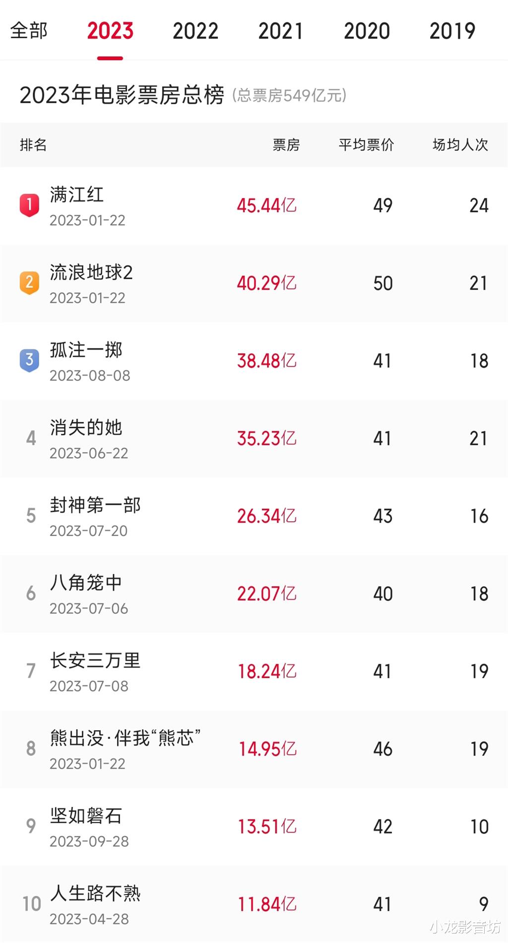 2023电影票房总榜出炉,总票房不及2017年,《满江红》夺冠