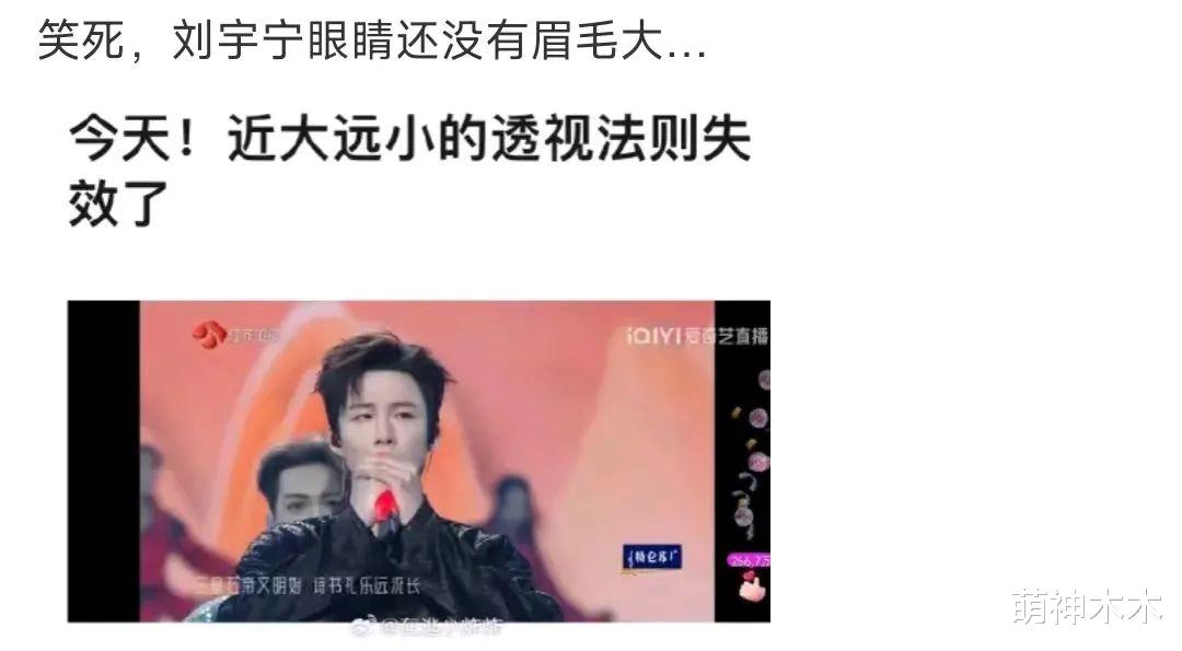 刘宇宁和曾舜晞唱了江苏卫视的开场节目,但是有些尴尬的是,刘宇宁的眉毛画得太粗了,他的眼睛又不大,这就让观众看着很奇怪。