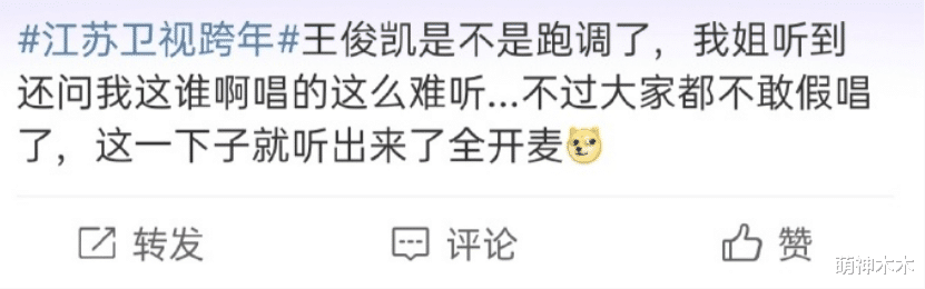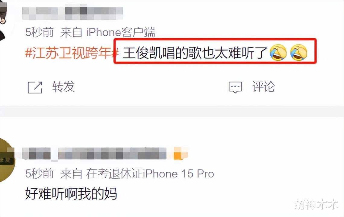 王俊凯现身江苏卫视晚会,连唱两首歌,刚上场唱新歌《你会找到我》就被听出有些走调破音,观众直接吐槽难听,不过也能听出来确实是真唱了。