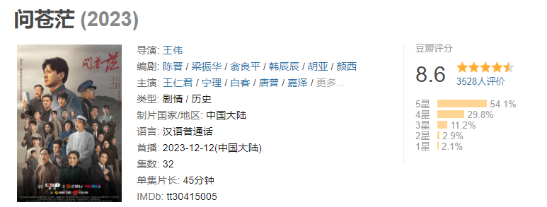 但电视剧《问苍茫》堪称2024年的国剧开门红,电视剧在12月中旬上线,发酵了半个月后,收获8.6分的口碑成绩,网络热度方面,《问苍茫》表现确实一般。