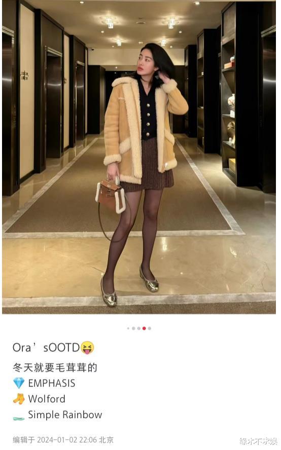 1月2日,杨采钰晒出一组新穿搭,称“冬天就要穿得毛茸茸”,身上便是被抓拍时所穿那一套,再看杨采钰自拍的背景,也有点像酒店。