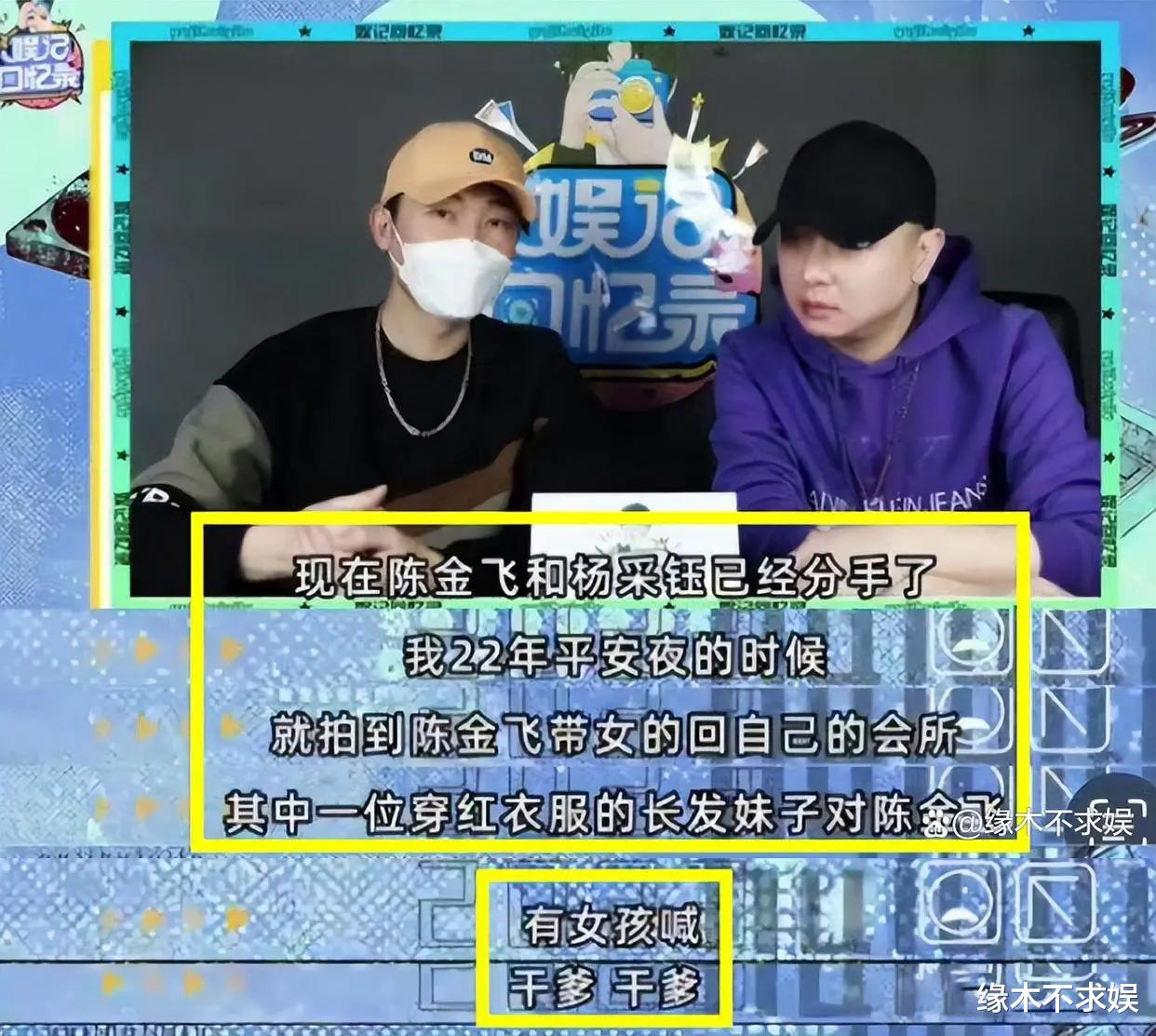 不过早在2022年的时候,狗仔便爆料杨采钰和陈金飞已经分手。当年的平安夜,陈金飞带女子回会所,一位穿红衣服的长发美女对陈金飞大喊“干爹”。