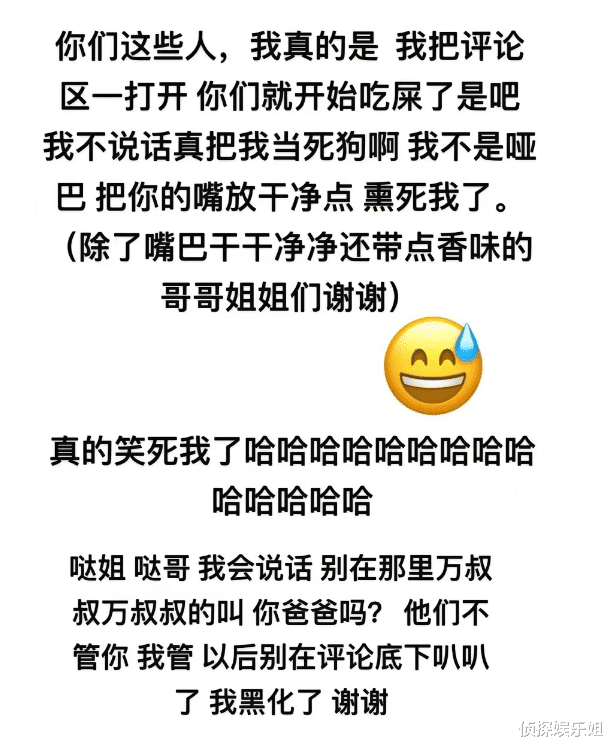 甜馨这次是真的生气了,她写道:“你们这些人,我真的是,我把评论一打开你们就开始吃屎了是吧”,语气十分愤怒。小妮子还直言自己不是哑巴,让恶评者把嘴巴放干净点。文末,甜馨还称自己黑化了。整篇回应,小妮子虽然写下了很多个“哈哈哈”,但莫名就让人有些心疼,毕竟这些都和甜馨无关。