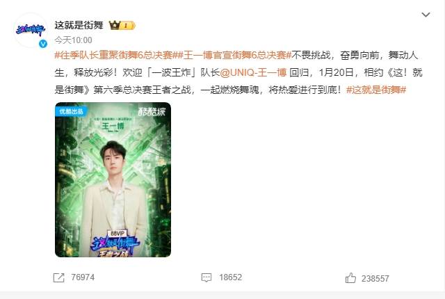 今日,《这就是街舞》第六季官宣导师阵容,王一博、张艺兴回归的消息在网络上引起热烈的讨论。作为正当红的流量偶像,动辄千万的粉丝量引起轰动一点儿都不稀奇,虽说之前也通过种种路透消息,粉丝们早已经打探到自家偶像继续坐镇的“内幕”, 官方平台的正式发布还是给粉丝们吃了一颗强有力的“定心丸”。