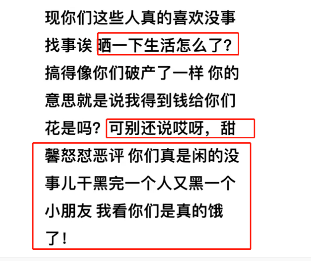 甜馨表示,自己发这些视频,只是为了记录一下生活,没想到搞得跟其他网友破产了一样,甚至还有一些人对自己道德绑架,甜馨在配文中反问网友:“难道我赚了钱,自己不能花,还得给你们花么?”