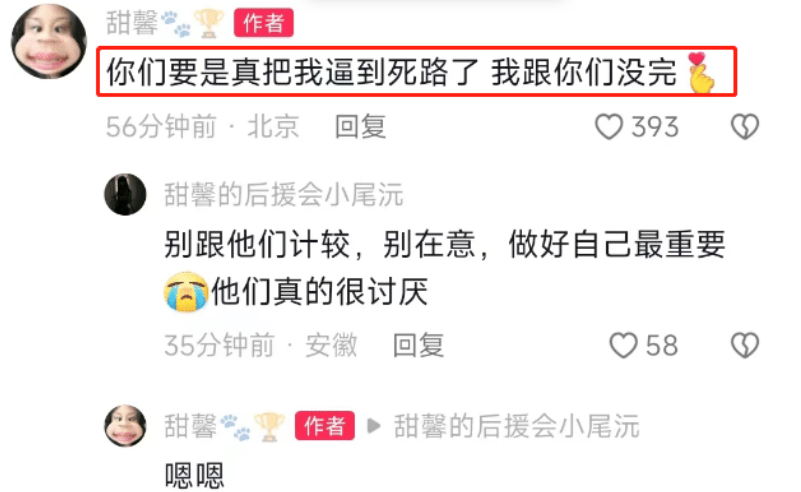 或许是经常被类似的评价攻击,甜馨在视频的评论区,还留言回怼网友,称:如果那一天自己被逼上死路,就跟他们没完,由此可见,甜馨对于这次的事情,的确是很伤心,毕竟才是一个十几岁的小女孩,却因为自己的身份,承受了太多